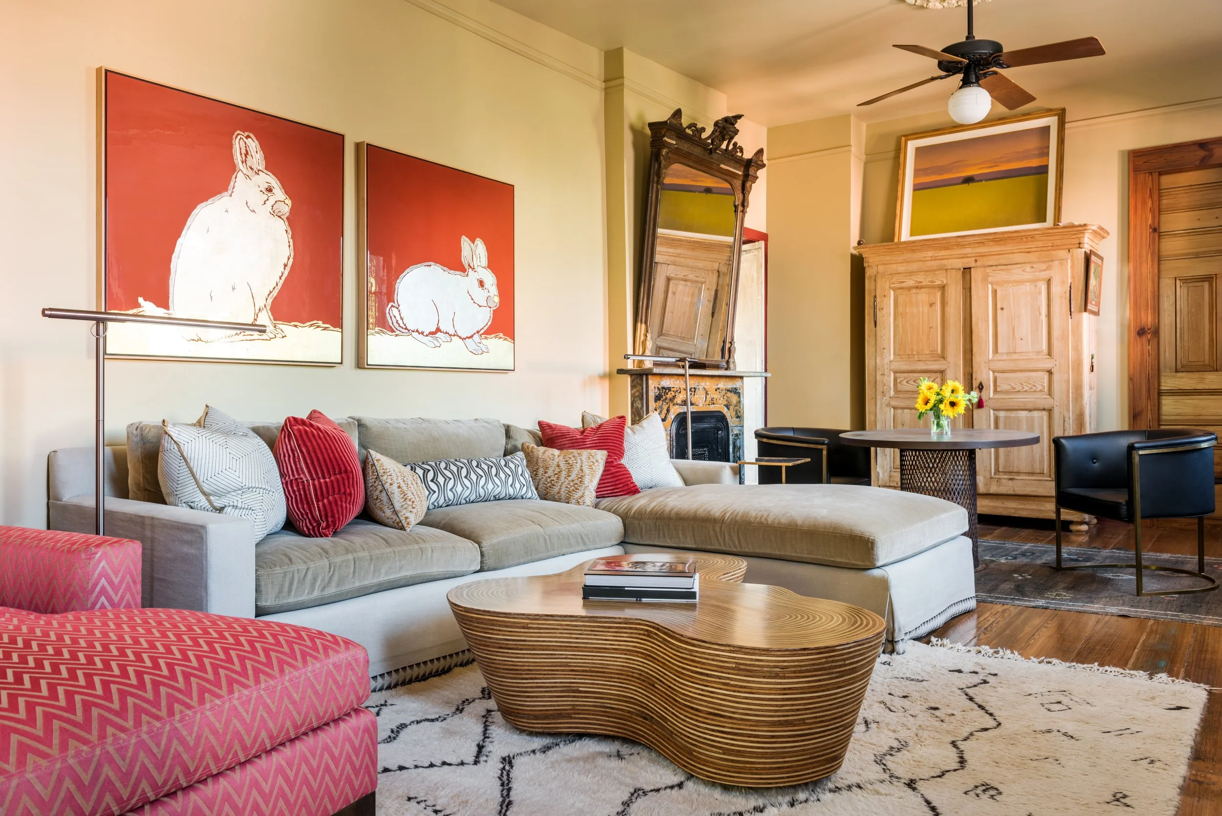 Golden yellows and warm oranges move through the rooms, catching the light and keeping a connection to the river just beyond the windows.