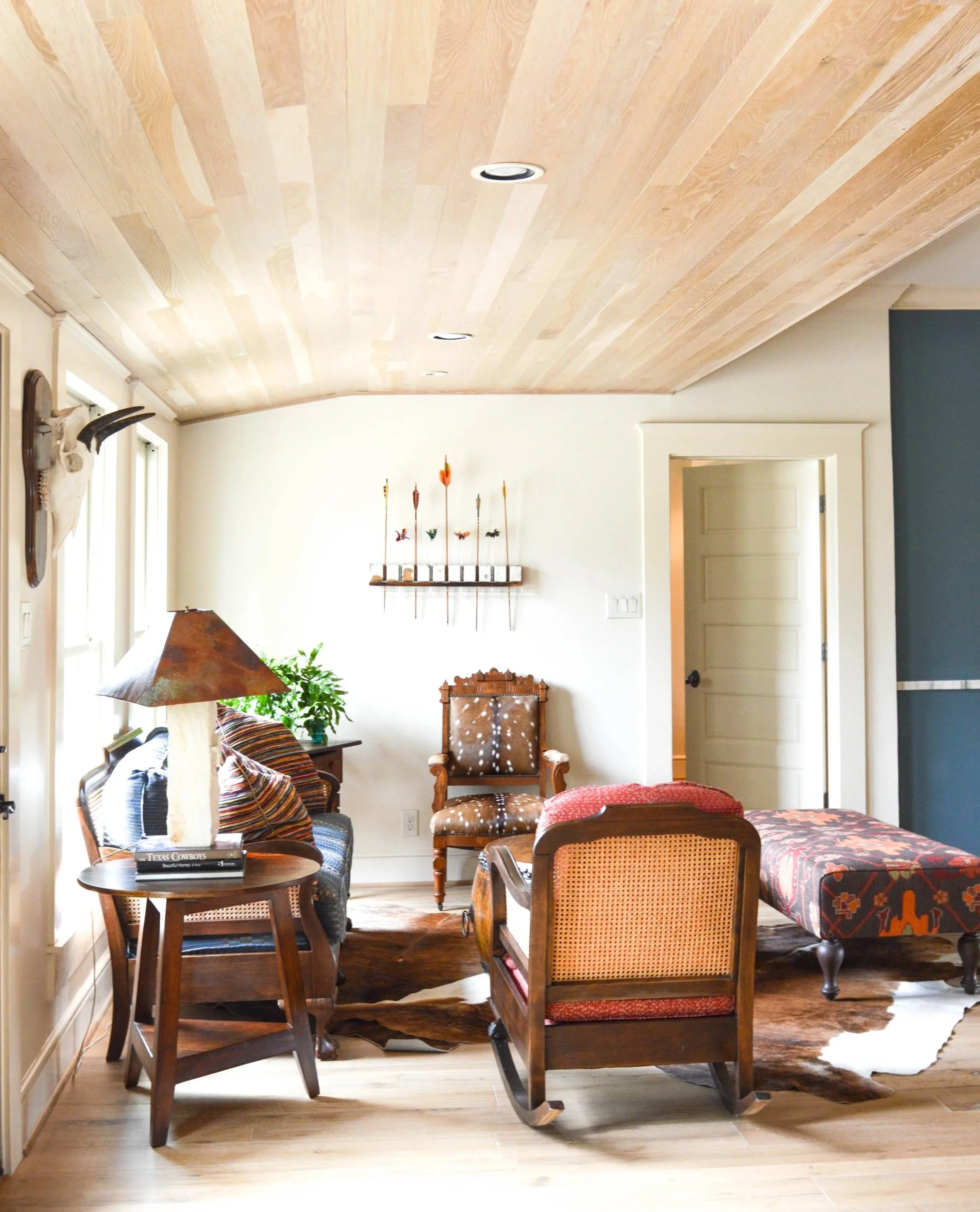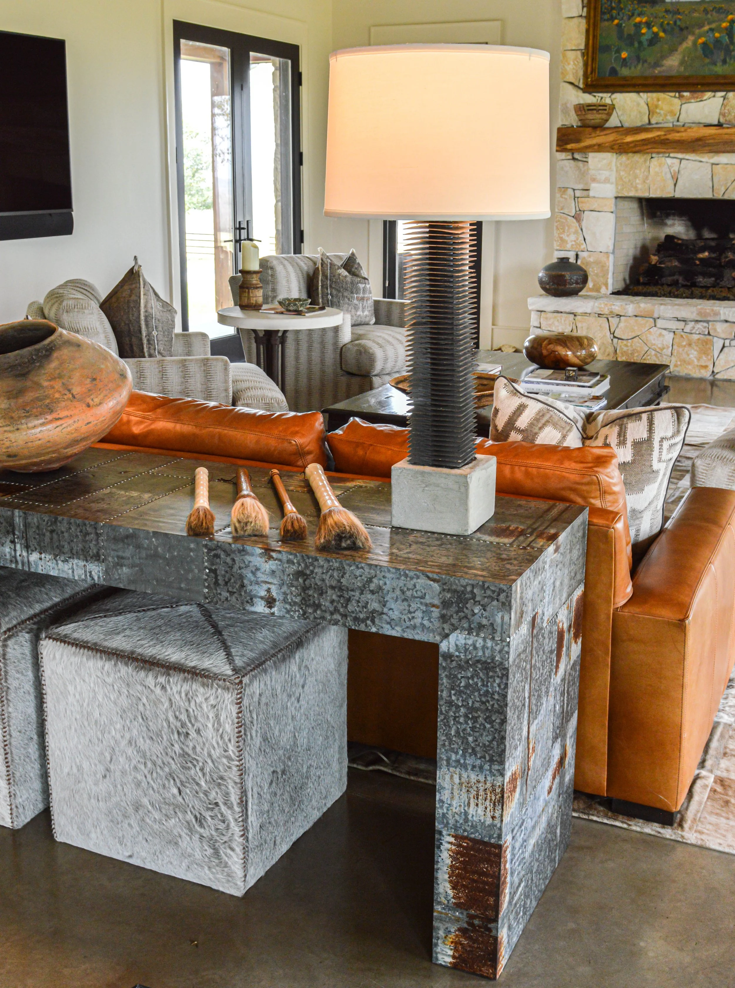Galvanized steel, leather, and hide introduce texture and patina, while warm woods and layered textiles soften the space.